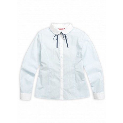 Блузка для девочек. Новое цветовое сочетание: комбинирование мелкой полоски основного цвета и белого в отделочных деталях (воротник, центральная планка, манжеты). Съёмный декоративный бантик из тесьмы.  Коллекция - школа.