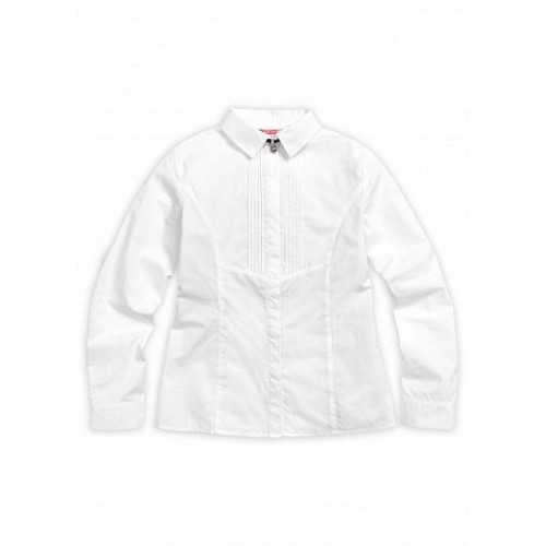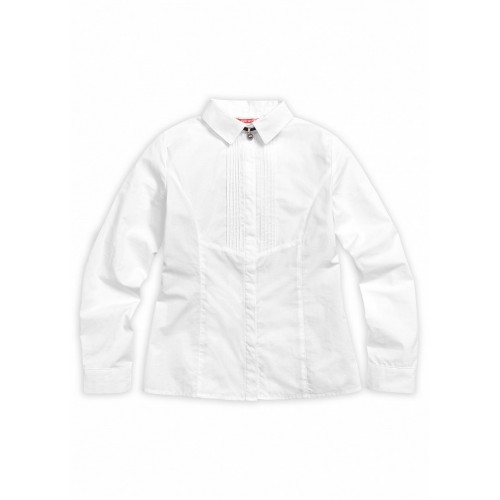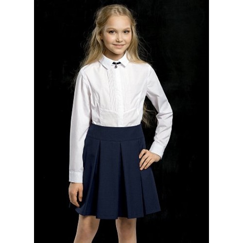 Блузка для девочек. Новый элемент: на передней части изделия вертикально застроченный узкие складки, которые уходят в подрез. Скрытая застёжка. Воротник классической формы с заострёнными уголками. В области воротника съёмный декоративный элемент (чокер) с перламутровой бусиной. Коллекция - школа.