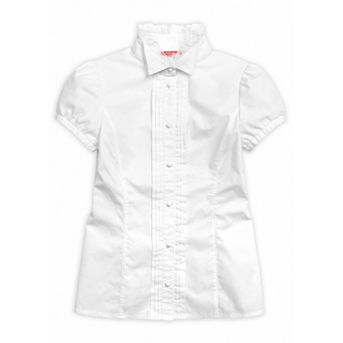 Блузка для девочек с коротким рукавом. Классический полуприлегающий силуэт с рельефами по переду и спинке, рукав-фонарик на узкой аккуратной манжете. Перед декорирован тремя вертикальными складками с каждой стороны планки. Воротник-стойка с отгибающимися уголками, декорирован кружевом. Коллекция - школа.
