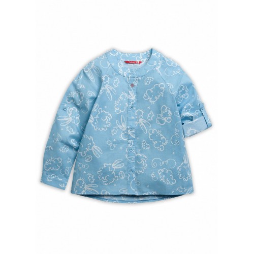Классическая блузка в нежных девичьих цветах, по всему изделию принт - невесомые облака-зайчики. Интересное дизайнерское решение - одна пуговица по переду отличается по цвету и выполнена в форме цветочка, что придаёт изделию дополнительную изюминку. Силуэт слегка расширяется к низу, небольшой перепад длин переда и спинки.  Длина рукава регулируется с помощью паты.