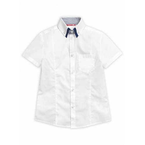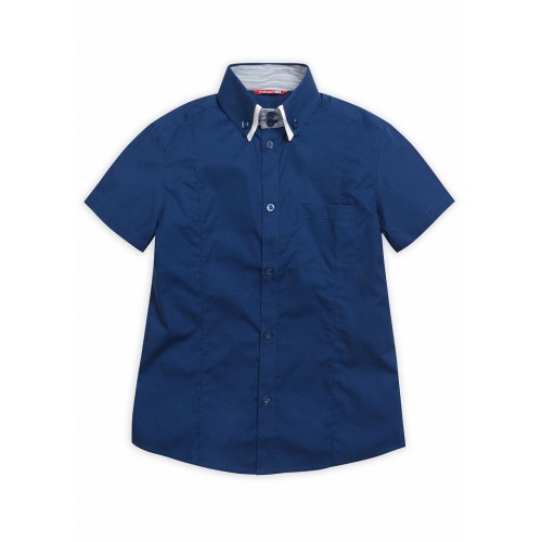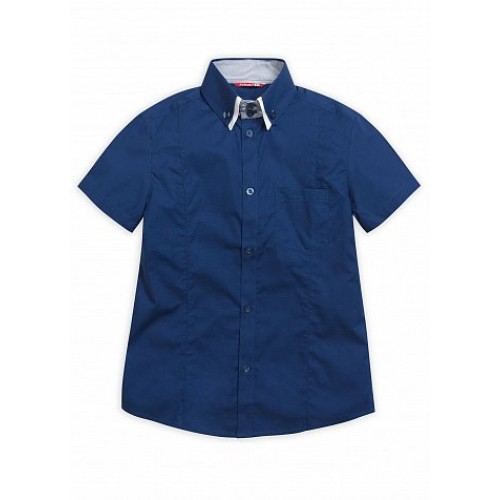 Приталенная сорочка с коротким рукавом с вертикальными рельефами на переде и спинке. Воротник двойной на высокой стойке. Ширина воротника и высота стойки уменьшены (по сравнению с прошлыми коллекциями). Петли на планке выполнены контрастными нитками в цвет отделочной ткани воротника. Коллекция - школа.