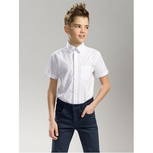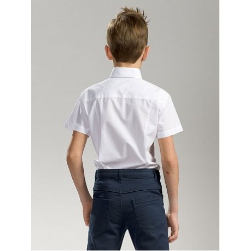 Сорочка с коротким рукавом для мальчиков. Сорочка малого обьема полуприлегающего силуэта. Вертикальные рельефы по переду и спинке. Воротник типа Windsor с декоративными членениями, концы пристегиваются к стойке на нижнюю пуговицу. Верхняя пуговица на воротнике декоративная.