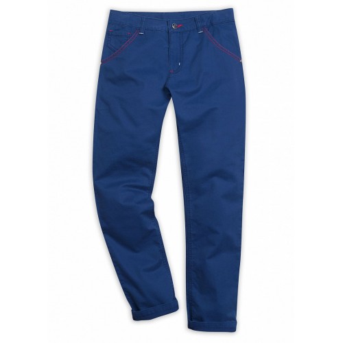 Брюки из хлопка зауженного силуэта. Брюки с классическими джинсовыми карманами. Задние карманы декорированы подрезами. Потайная регуляция брюк по талии, предусмотрены шлевки. Пуговицы в стиле истории.