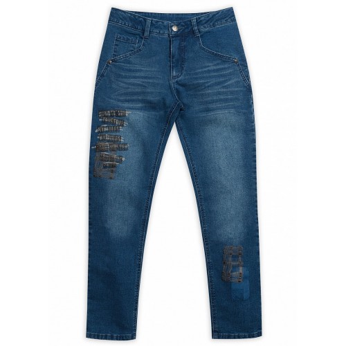 Джинсы для мальчиков. Джинсы с начесом, умеренного обьема, зауженные к низу; регулировка ширины брюк по поясу. На переде карманы необычной фигурной формы; металическая фурнитура; принт.
