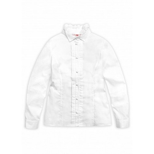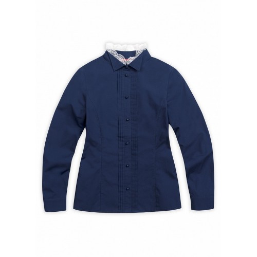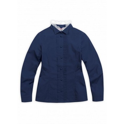 Блузка для девочек. Классический полуприлегающий силуэт с рельефами по переду и спинке. Перед декорирован тремя вертикальными складками с каждой стороны планки. Воротник-стойка с отгибающимися уголками, декорирован кружевом. Коллекция - школа.