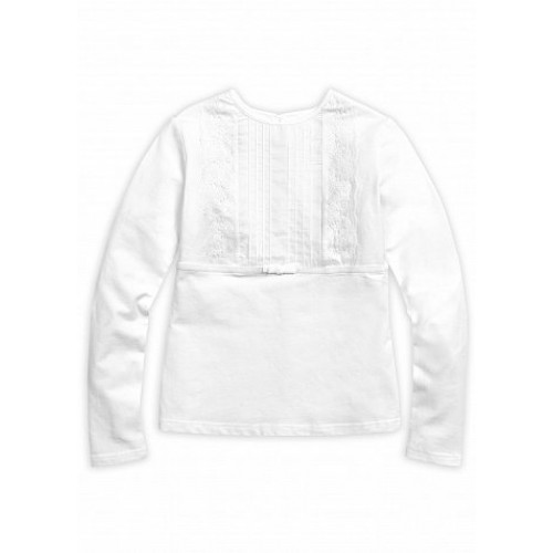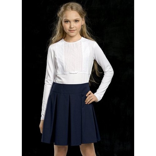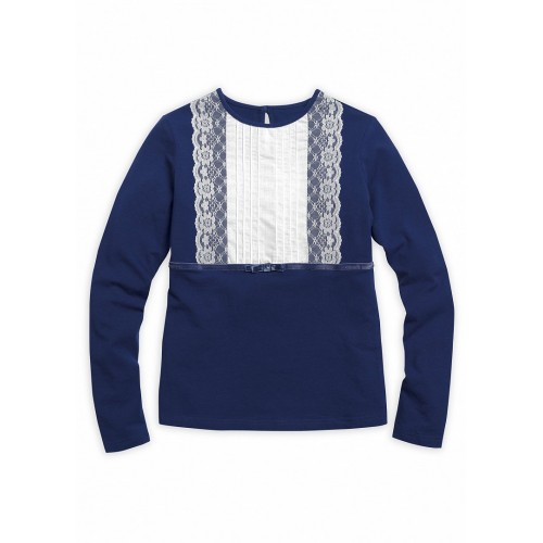 Джемпер для девочек. Центральная сложная вставка из ткани, имитирующая декорированную складками блузку, из плотной хлопковой ткани. Во вставке застрочены тонкие вертикальные складки для придания фактурности. По бокам вставки располагаются вертикальные полоски кружева, низ вставки подчёркнут эластичной бархатной тесьмой и бархатным бантиком по центру. Коллекция - школа.