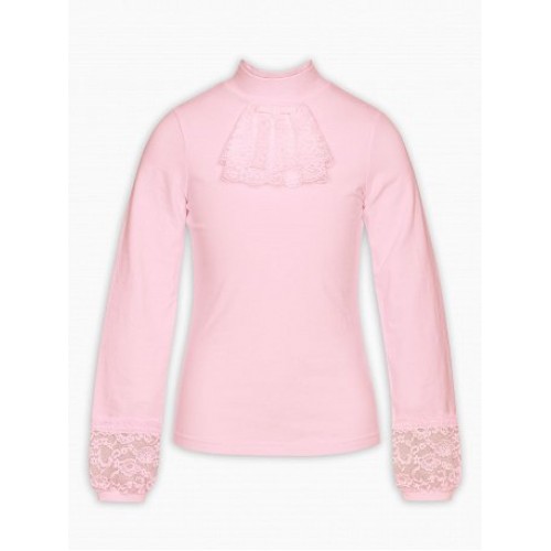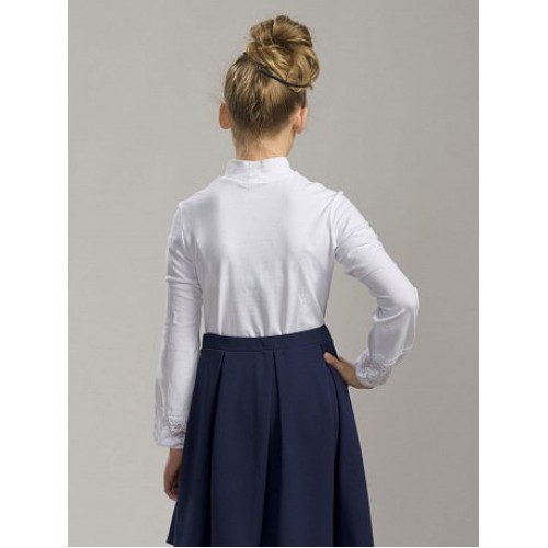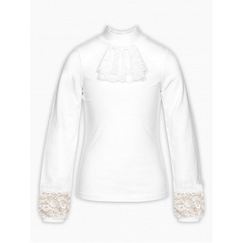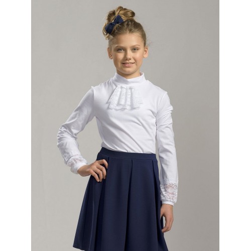 Джемпер для девочек. Модель джемпера, которая подходит как для повседневной носки, так и для торжественных школьных случаев. Неоспоримая романтика и нежность: по низу рукава вставка из широкого кружева с узкой изящной манжетой, которая собирает умеренно расширенный к низу рукав. Воротник-стойка украшен легким кружевным жабо и маленьким бантиком.