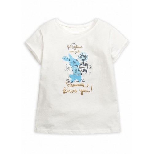 Футболка для девочек свободного силуэта. Классический втачной короткий рукав. Горловина и низ рукава украшены декоративной сеткой. Графический принт.