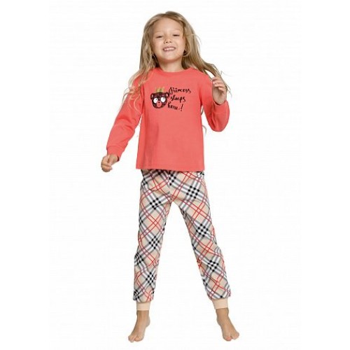 Пижама для девочек: джемпер и брюки. На джемпере центральный принт каррикатурный мишка. Брюки в стильную клетку, манжеты по низу брючин.