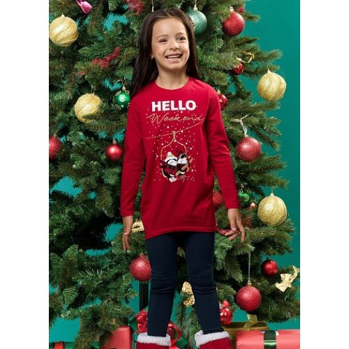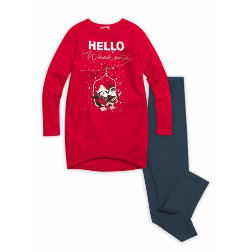 Комплект для девочек: туника и лосины. Туника  умеренного объема; низ изделия заужен, форма "бочонок", боковые швы переведены на перед; перепад длин переда и спинки; металлизированный принт с надписью  " Здравствуйте# Выходные". Классические лосины.