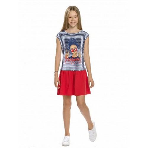 Платье для девочек. Свободный силуэт, мягкая спущенная линия плеча. Членение ниже уровня талии имитирует футболку, надетую навыпуск на юбку. Текст в принте с голографической посыпкой.