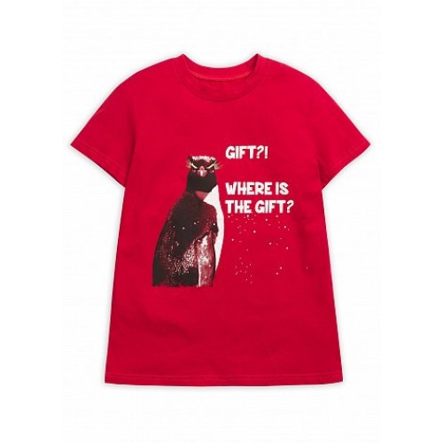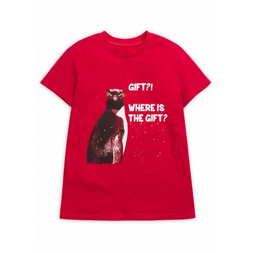 Футболка для мальчиков. Классическая футболка с центральным принтом и надписью "Подарки? Где подарки?".