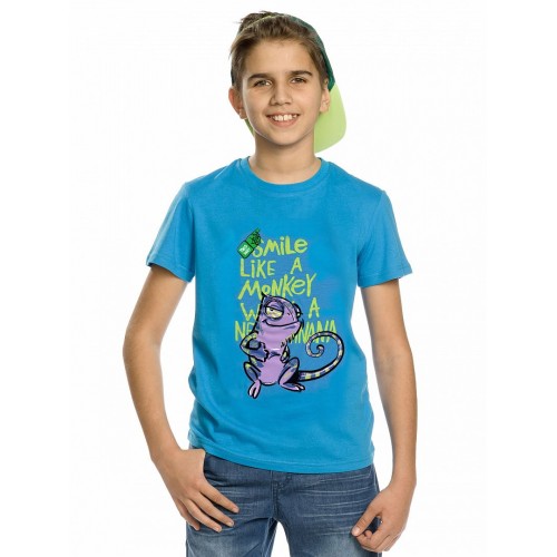 Футболка для мальчиков. Классическая футболка прямого силуэта не стесняющего движений ребенка. Декорирована центральным оригинальным принтом. Перевод принта "Улыбайся, как обезьянка с новым бананом".