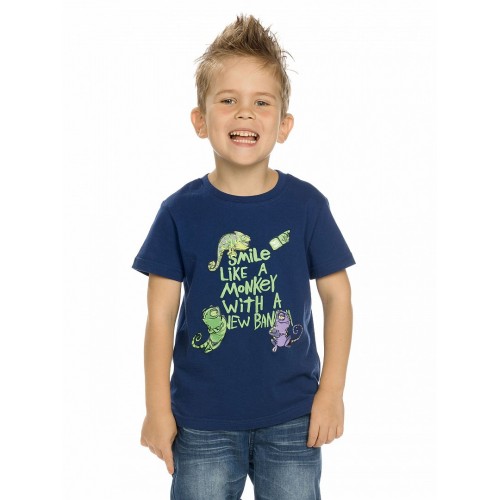 Футболка для мальчиков. Классическая футболка прямого силуэта не стесняющего движений ребенка. Декорирована центральным оригинальным принтом. Перевод принта "Улыбайся, как обезьянка с новым бананом".