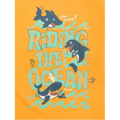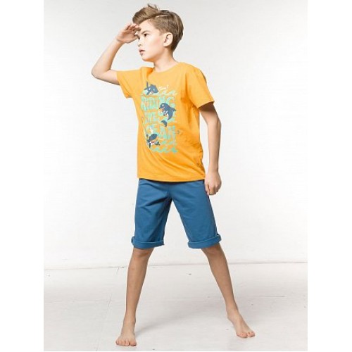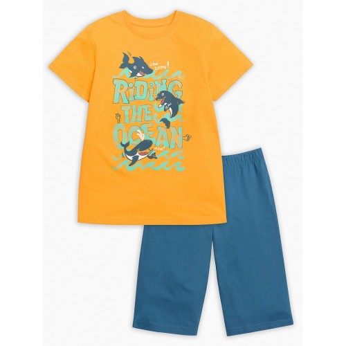 Пижама для мальчиков: футболка и бриджи. Футболка выполнена в оранжевом цвете, центральный принт морские обитатели и надпись (перевод) "Оседлай океан". Бриджи выполнены в синем цвете, по поясу изделия внутренняя резинка.