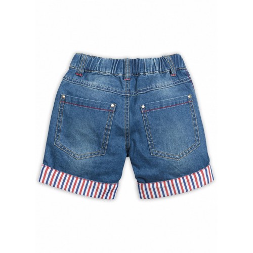Шорты из тонкой джинсы на расстроченном эластичном поясе, с отворотами по низу из ткани в полоску. Внутренняя регулировка декоративным шнуром. Предусмотрены шлёвки.