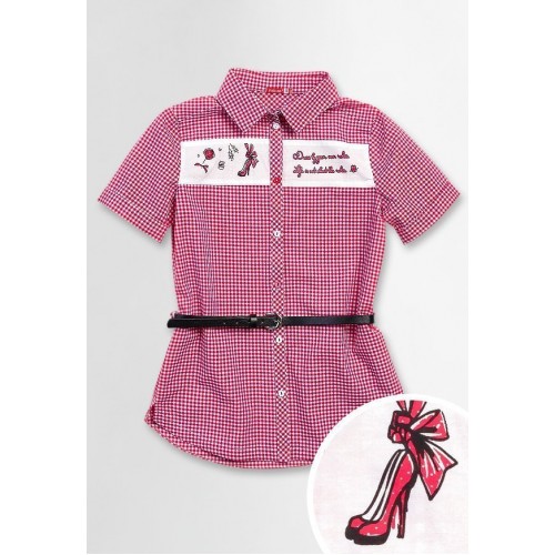 Блузка для девочек удлиненная, с коротким рукавом (ремень из иск. кожи). Особенности: тонкий плотный рубашечный хлопок, ремень из иск. кожи. В отделке используются стразы.