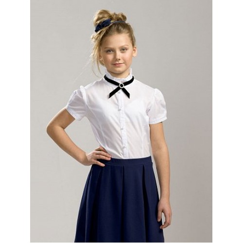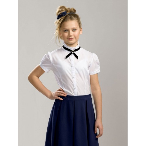Классическая блузка с коротким рукавом. Отличительные особенности модели — съемный декор, декоративные детали стойки и манжет рукавов, оформленные в вертикально заложенные односторонние складки.