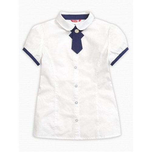 Классическая блузка с коротким рукавом. Воротник с закругленными концами придает нежный, романтичный вид блузке. В отделке низа манжет, стойке воротника используется контрастная темно-синяя ткань, обеспечивающая изделию практичность и высокую износостойкость. Декор съемный.