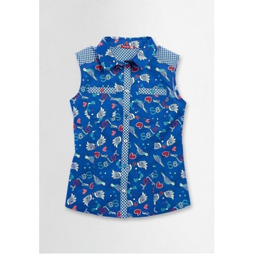 Яркая модель блузки без рукавов из тонкого плотного рубашечного хлопка. Насыщенные цвета, яркий принт, и разноцветные пуговицы - все в этой модели продуманно и гармонично.