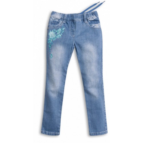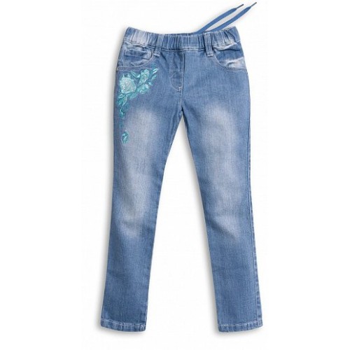 Плотная джинсовая ткань; прямой крой; пояс с регулировкой внутренней резинкой; вышивка