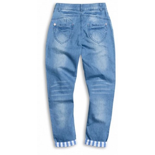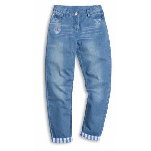 Джинсовые брюки свободного кроя вверху и зауженные книзу, с необычной формой задних карманов, оригинальные клёпки с сердечками создают романтический настрой.