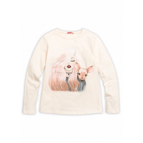 Джемпер для девочек. Центральный натуралистичный принт - современная фея с маленьким оленёнком.