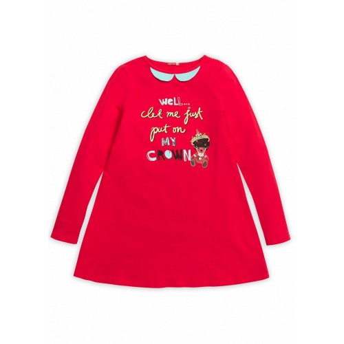 Туника для девочек. В верхней части прилегающий силуэт, к низу расширенный А-силуэт; зауженный плечевой пояс и узкие облегающие рукава; контрастный принтованный воротничок; металлизированный принт.