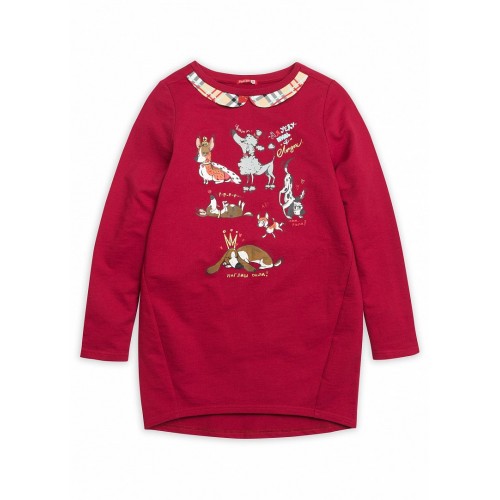 Туника для девочек. Умеренный обьем; низ изделия заужен, форма "бочонок"; боковые швы переведены на перед; перепад длины переда и спинки; горловина переда декорирована принтованным воротничком.