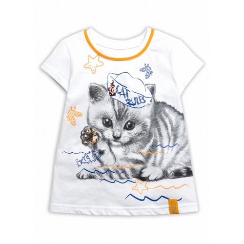 Классическая футболка с умеренным объемом, декорирована интересной двойной отделкой горловины: обычный пайпинг+ контрастный пайпинг с необработанным краем. Аккуратный двойной рукавчик позволяет сделать необычный отворот по низу: более широкий вверху и очень узкий под проймой. По переду принт - "морской котик" в капитанской шапочке: фотопринт котика и отрисованные вручную контурные рыбки, морские звезды, волны, а также милое сердечко на лапке.