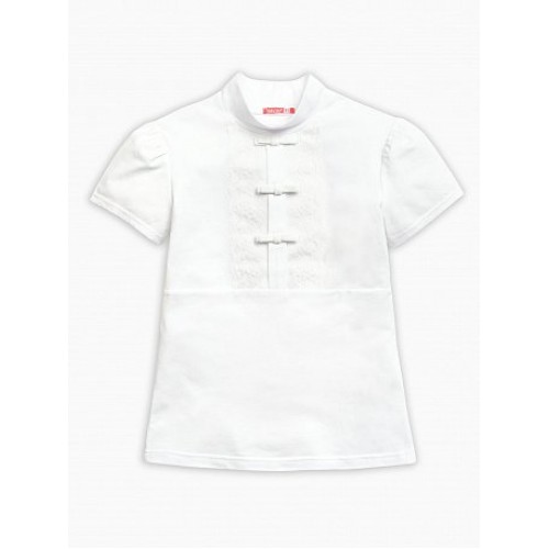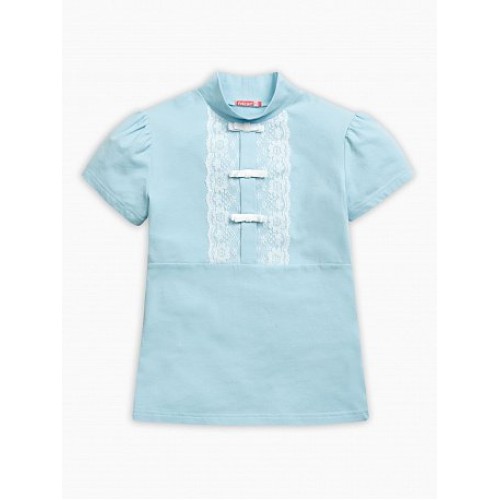 Футболка для девочек. Модель с имитацией планки по переду до талии. Вместо пуговок — планка, декорированная бархатными бантиками, а по краям — настрочено кружево.