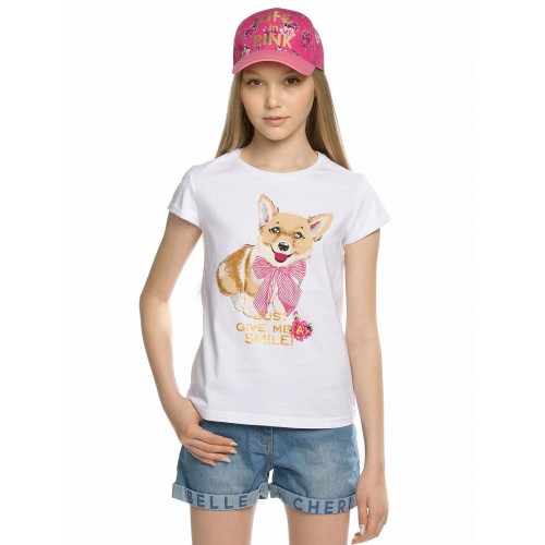 Футболка для девочек. Классическая футболка, центральный принт - милаш-корги и надпись (пер.) "Подари нме улыбку".