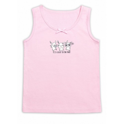 Майка для девочек. Изготовлена из хлопка. На майке на передней части изделия принт мультяшных зверушек и надпись, горловина декорирована аккуратным бантиком.