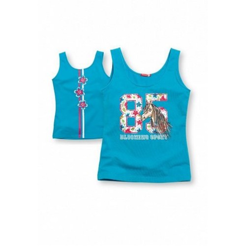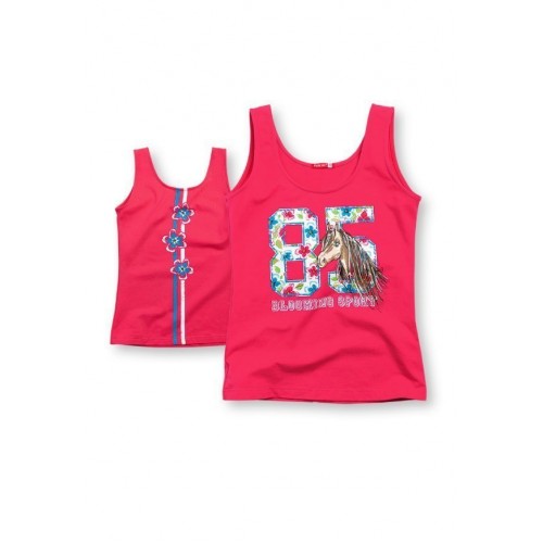 Очень яркая модная майка с трендовым смешением романтики и  спортивного стиля, которые мы видим сегодня на подиумах всего мира. Спортивную тематику в этой модели поддерживают лампасы и крупные цифры, а смягчают образ романтичные цветы и любимая всеми девочками - лошадка.
