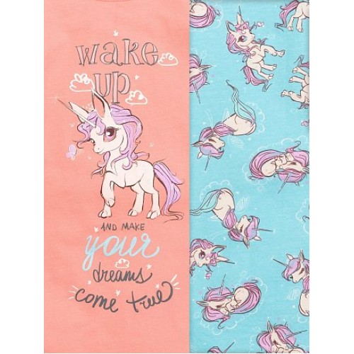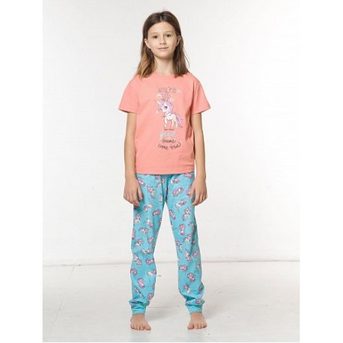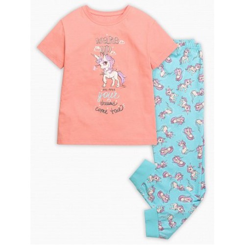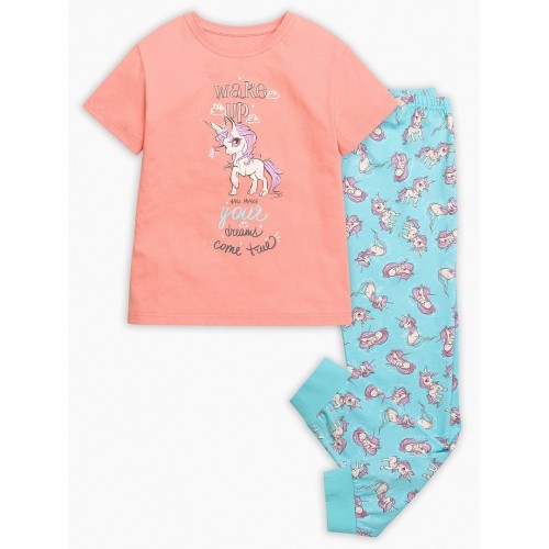 Пижама для девочек: футболка и брюки. Футболка выполнена в нежном персиковом цвете. Центральный принт - волшебный пони и надпись (перевод) "Проснись и воплоти свои мечты". Брюки голубого цвета в all over принт- волшебные пони. По поясу изделия внутренняя резинка, по низу - манжеты из основной ткани.