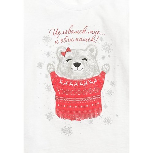 Пижама для девочек: джемпер и брюки. На джемпере центральный принт - зимний мишка. На брюках олловер принт в традиционном рождественском стиле, по низу брючин- манжеты.