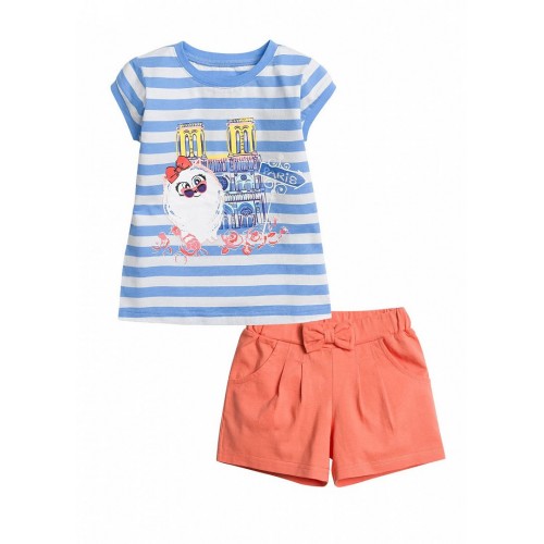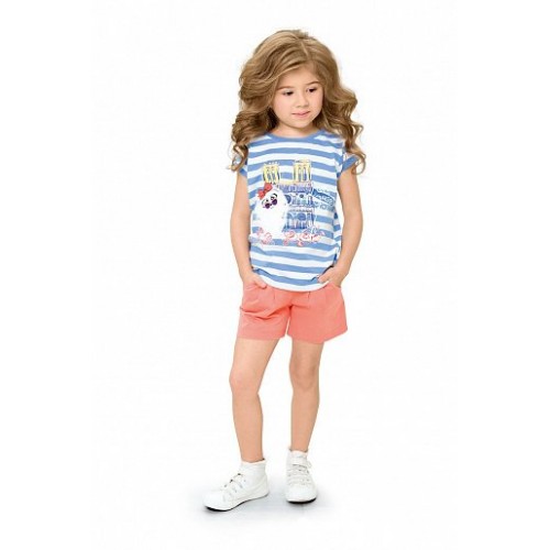 Футболка прилегающего силуэта со спущенными плечами и шортики напоминающие силуэт юбочки, с объёмным бантиком и кармашками.