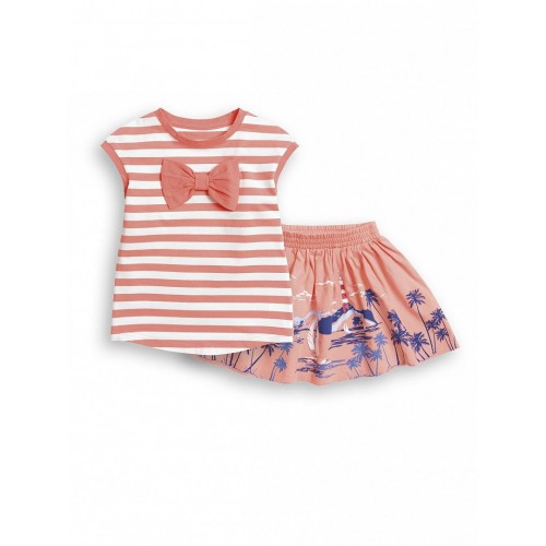 Футболка прилегающего силуэта со спущенными плечами, и красивым объёмный бантом, расположенным по по центру переда, лёгкая свободная юбка на широкой удобной резинке.