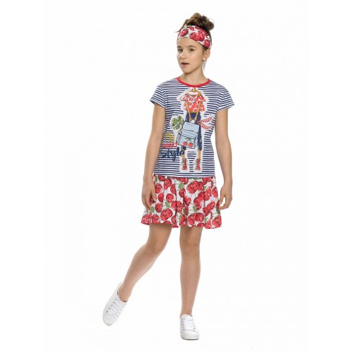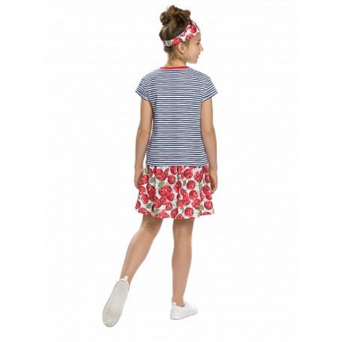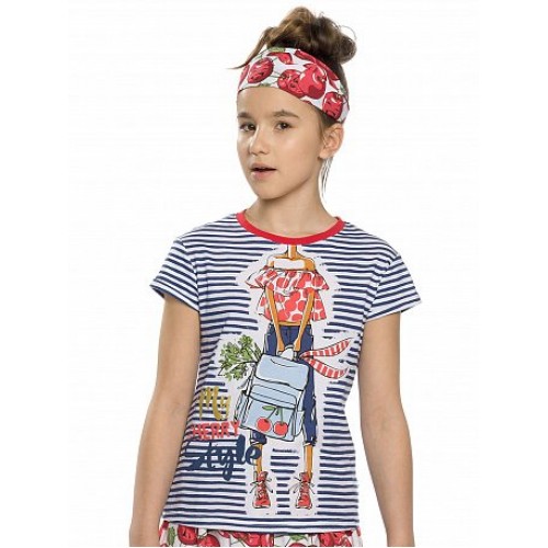 Комплект для девочек: футболка и юбка. Футболка умеренного объёма, по низу рукавов отвороты с закрепкой по краю. Расклешённая юбка, пояс на резинке.