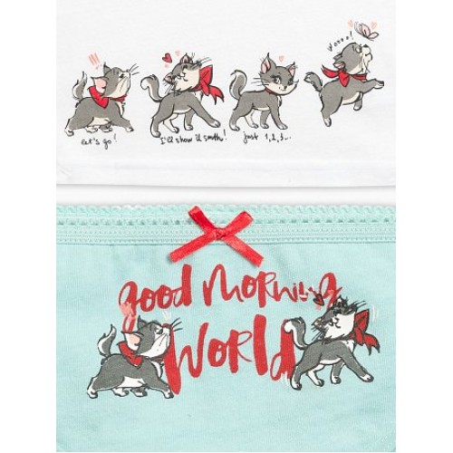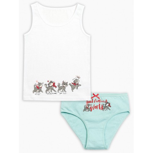 Комплект для девочек: майка и трусики. Классическая майка на широких лямках, "оживший" принт-купон по низу на передней части изделия в виде жизнерадостных кошечек. Трусики-слипы декорированы аккуратным бантиком, по талии - резинка с фестонным краем, принт- жизнерадостные кошечки и надпись (перевод) "Доброе утро, мир!".