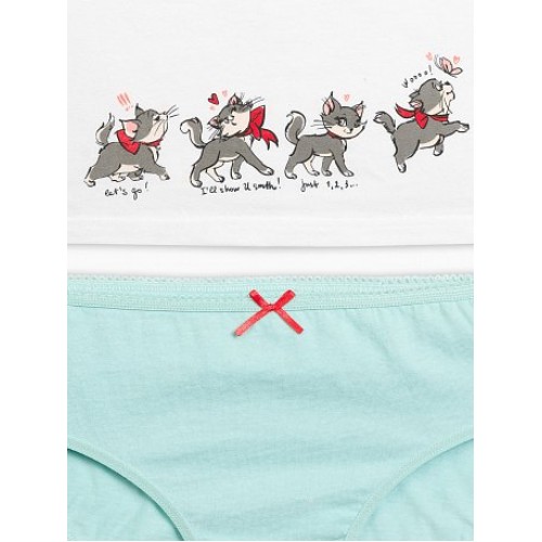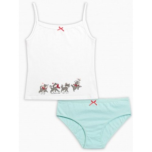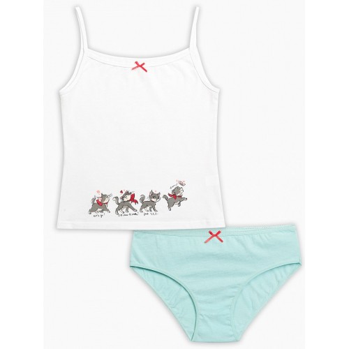 Комплект для девочек: майка и трусики. Майка-топ на тонких лямках, горловина декорирована аккуратным бантиком и ажурным краем, "оживший" принт-купон в виде жизнерадостных кошечек на передней части изделия. Трусики-слипы декорированы аккуратным бантиком. По талии - резинка с фестонным краем контрастного цвета.