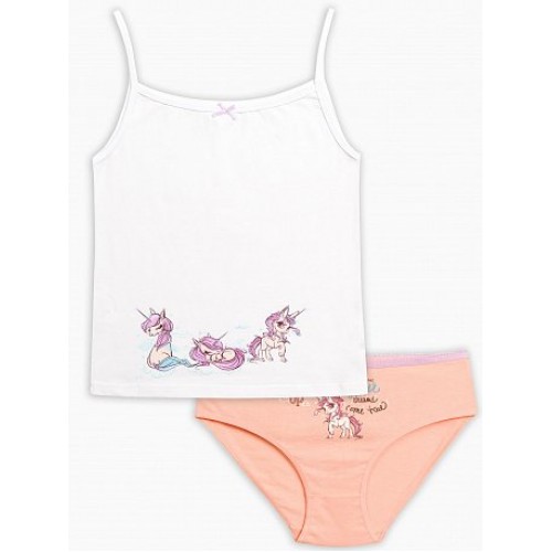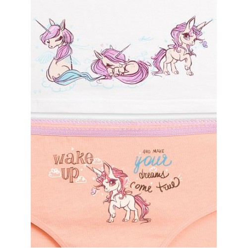 Комплект для девочек: майка и трусики. Классическая майка на тонких лямках, горловина декорирована аккуратным бантиком, принт по низу на передней части изделия - волшебные пони. Трусики-слипы с центральным принтом - волшебный пони и надпись (перевод) "Проснись и воплоти свои мечты". По талии - резинка с фестонным краем.