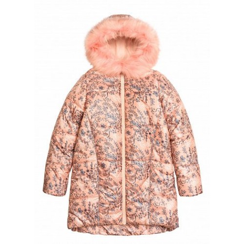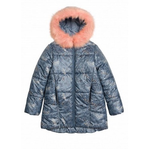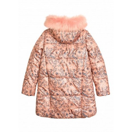 Куртка осенняя О - образного силуэта. Температурный режим: ** (до -15С). Наполнитель: синтепон (обеспечивает хорошие теплозащитные свойства в осеннюю непогоду). Ткань куртки имеет  водоотталкивающую пропитку, которая не дает  промокать во время дождя и одновременно отталкивает грязь с поверхности ткани. Капюшон не отстёгивается. Модное сочетание - ажурный цветочный принт и цветной мех (отстёгивается)! Перепад длин между между полочкой и спинкой. Внутренние манжеты из рибаны препятствуют задуванию ветра. Карманы в швах на потайной молнии. Световозвращающие канты.