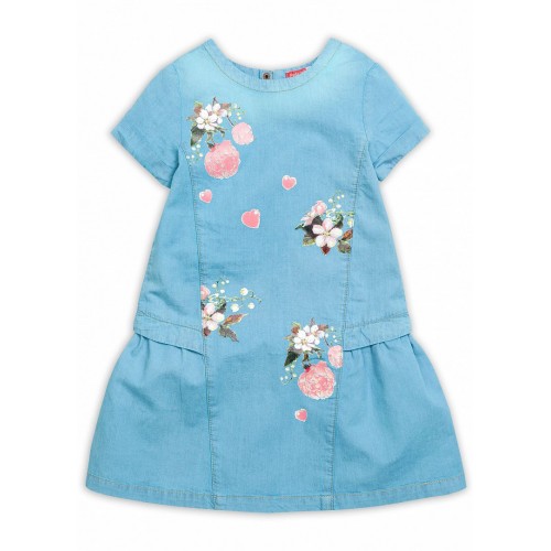 Джинсовое платье новой модели! Расширенный к низу силуэт. Платье "надел и пошел", застежка на одну кнопку по горловине спинки. Конструктивное решение верха имитирует два изделия одном. По переду принт - акварельные цветы.