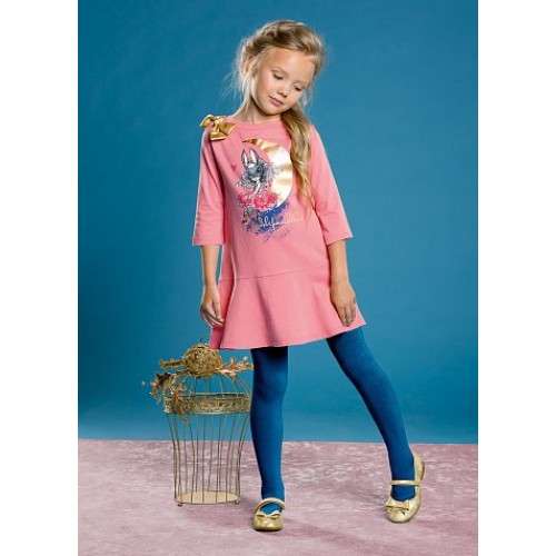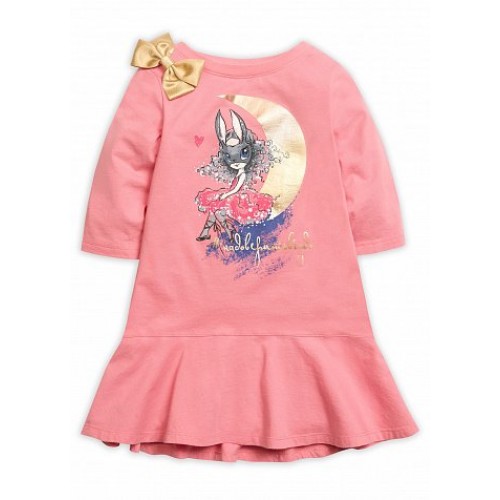 Платье для девочек. Новый крой! А-силуэт с отрезным валаном "солнце", имеет перепад длин по спинке и переду. Рукав 3/4, на плече бант из золотой ленты. Прочный Soft-принт c мерцающим золотом.