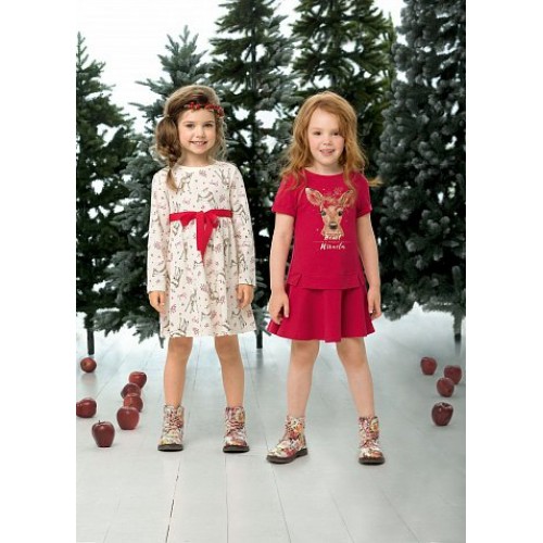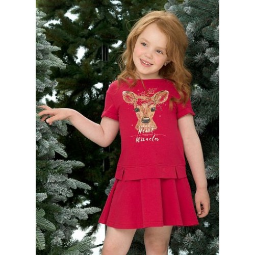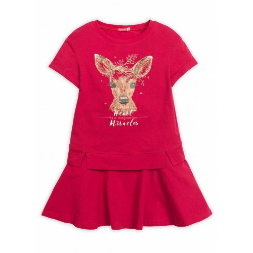 Платье с имитацией юбки и футболки на выпуск с разрезами по переду; мягкая линия плеча; по низу рукава манжета с отворотом; металлизированный принт.
