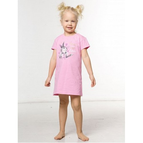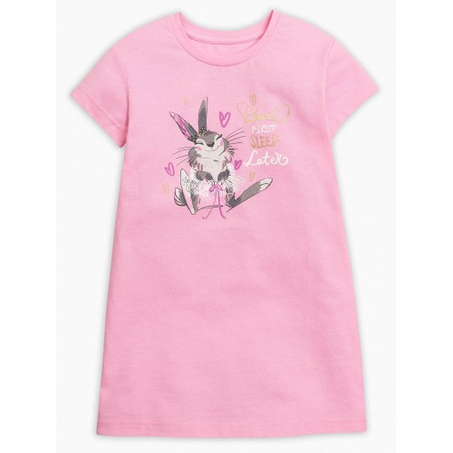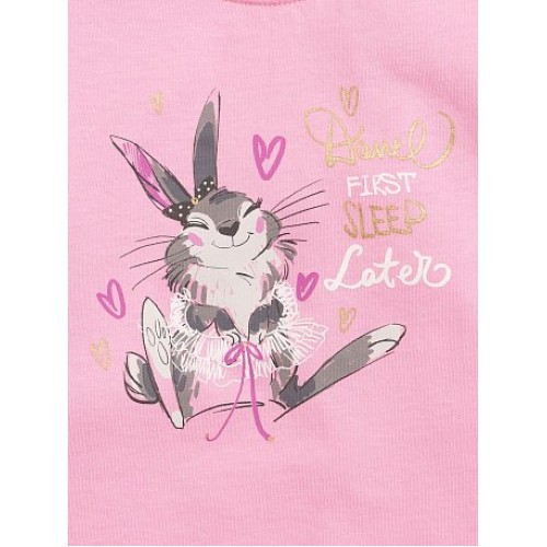 Ночная сорочка для девочек. Сорочка выполнена в розовом цвете. Центральный принт с золотом - зайка-балеринка и надпись (перевод) "Сначала потанцуем, поспим позже".