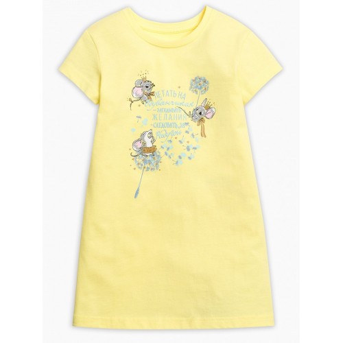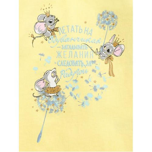 Ночная сорочка для девочек. Сорочка выполнена в жёлтом цвете. Центральный принт - мультяшные мышата, парящие на одуванчиках и надпись "Летать на одуванчиках, загадывать желания, следовать за радугой".