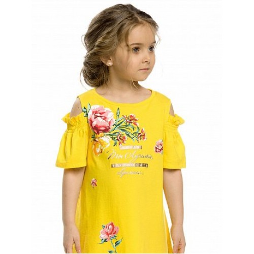 Платье для девочек. НОВИНКА! Более расширенный силуэт трапеция. Открытые плечи, новая форма объёмных рукавов-воланов, собранных на несколько рядов шпульной резины. Центральный принт с золотом.
