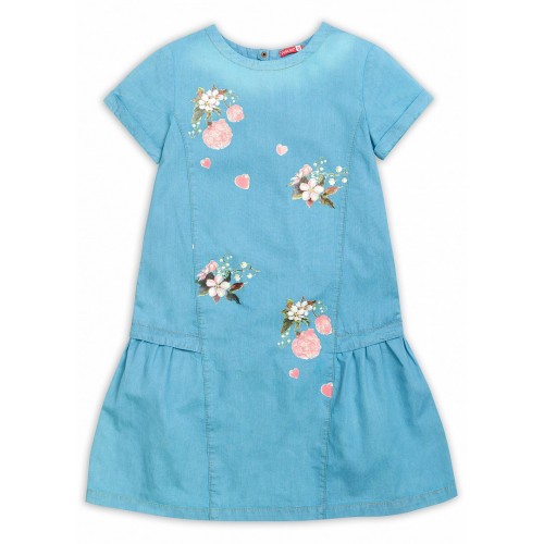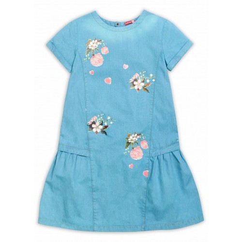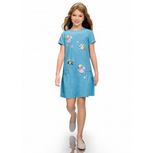 Джинсовое платье новой модели! Расширенный к низу силуэт.Платье "надел и пошел", застежка на одну кнопку по горловине спинки. Конструктивное решение верха имитирует два изделия одном. По переду принт - акварельные цветы.